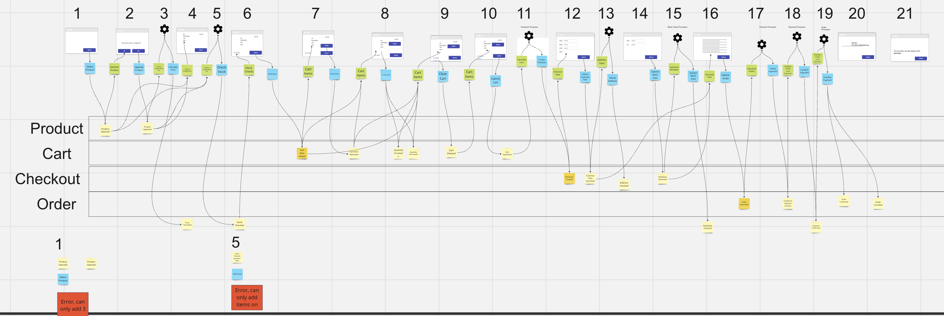 Das Eventmodell ist gleichzeitig komplette Dokumentation, Anforderungsdokument und Implementierungsanleitung. Hier finden sich chronologisch alle Aktionen die unser Business ausführt um Profite zu erwirtschaften.