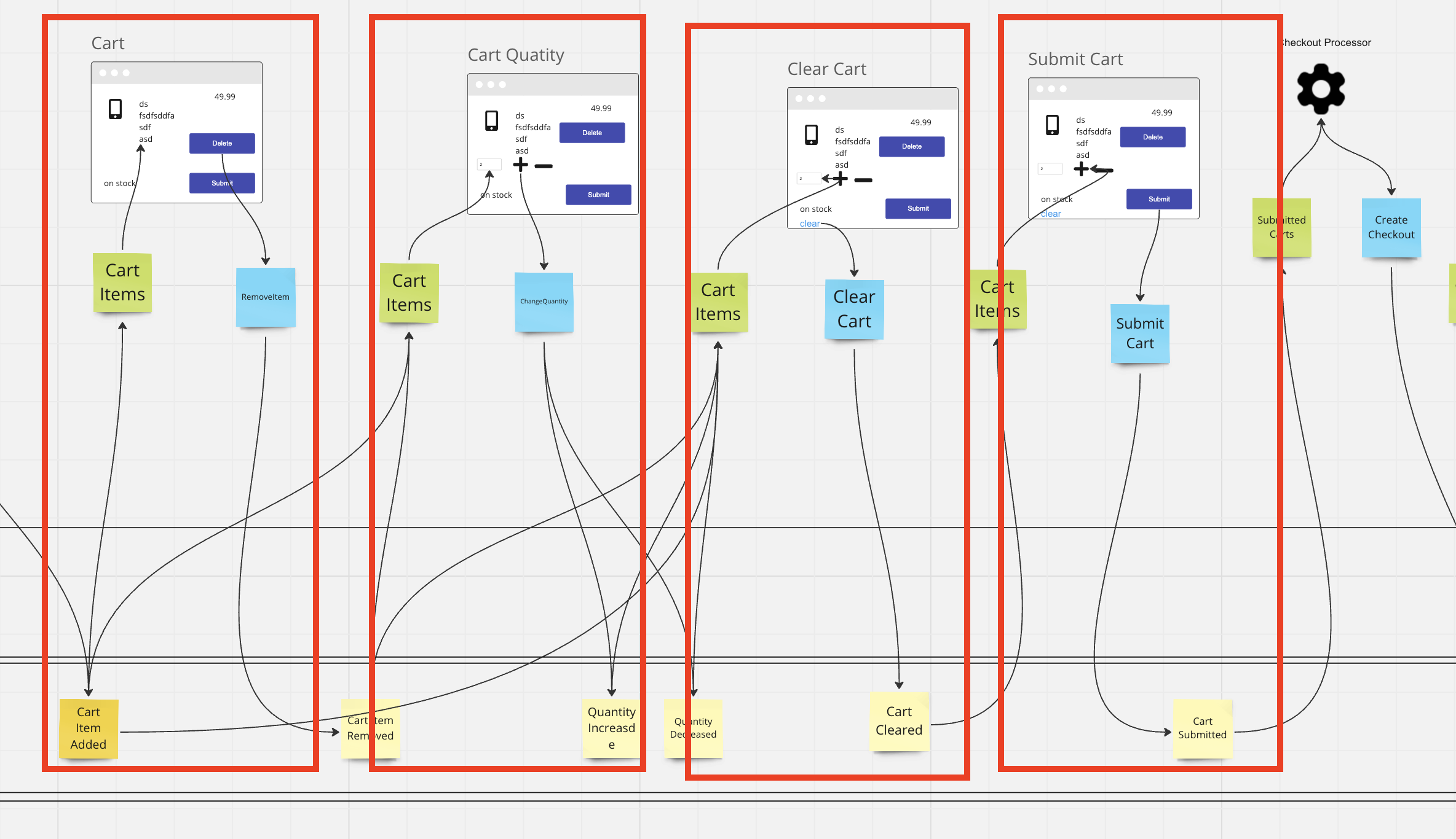 Die Bausteine sind Commands (blau), Events (orange) und Daten (Read Modelle) (grün).